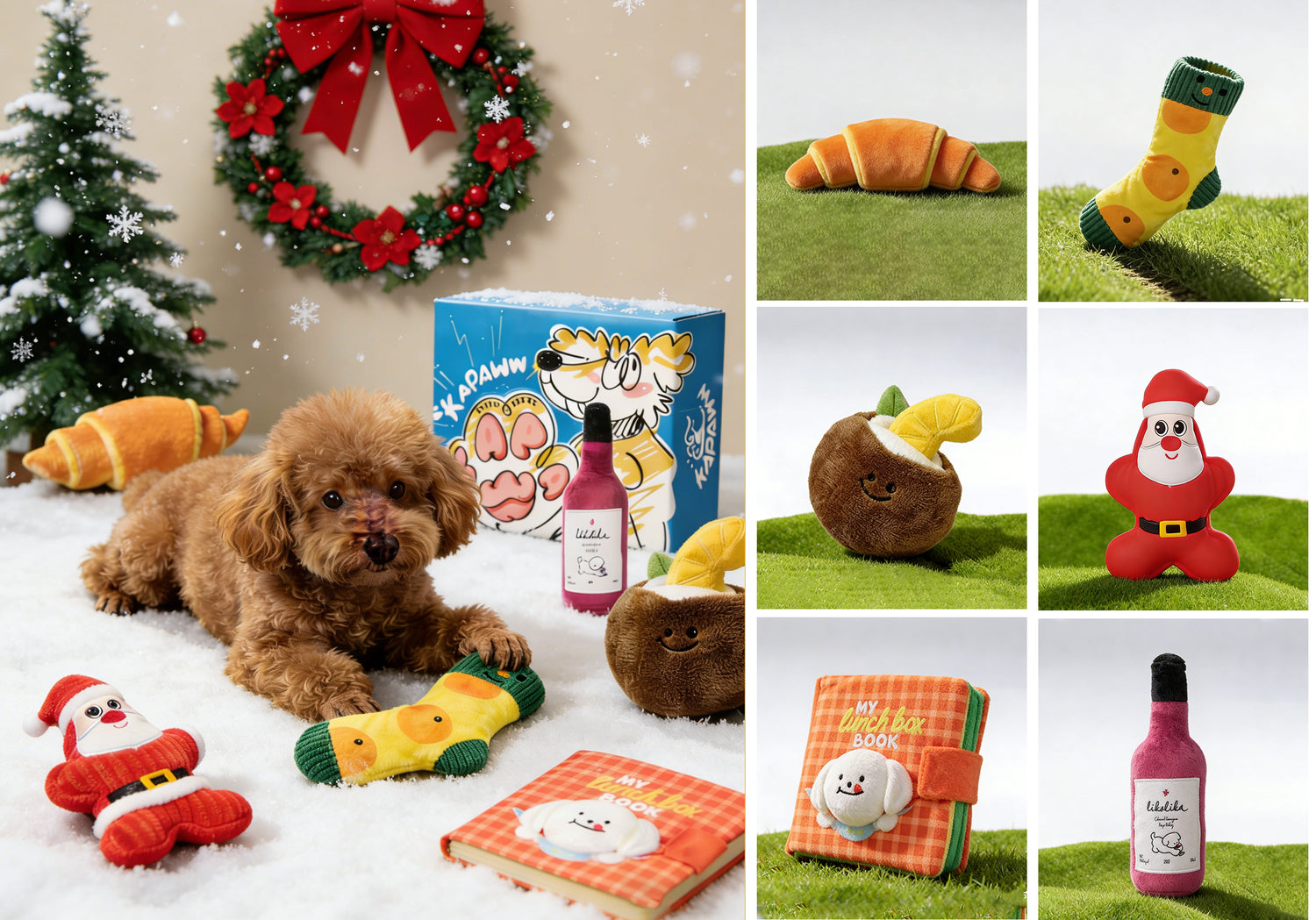 Plush Wine Bottle, Croissant Roll, Squeaky Sock, Coconut Ball, Lunchbox Snuffle Book Squeaky Santa.