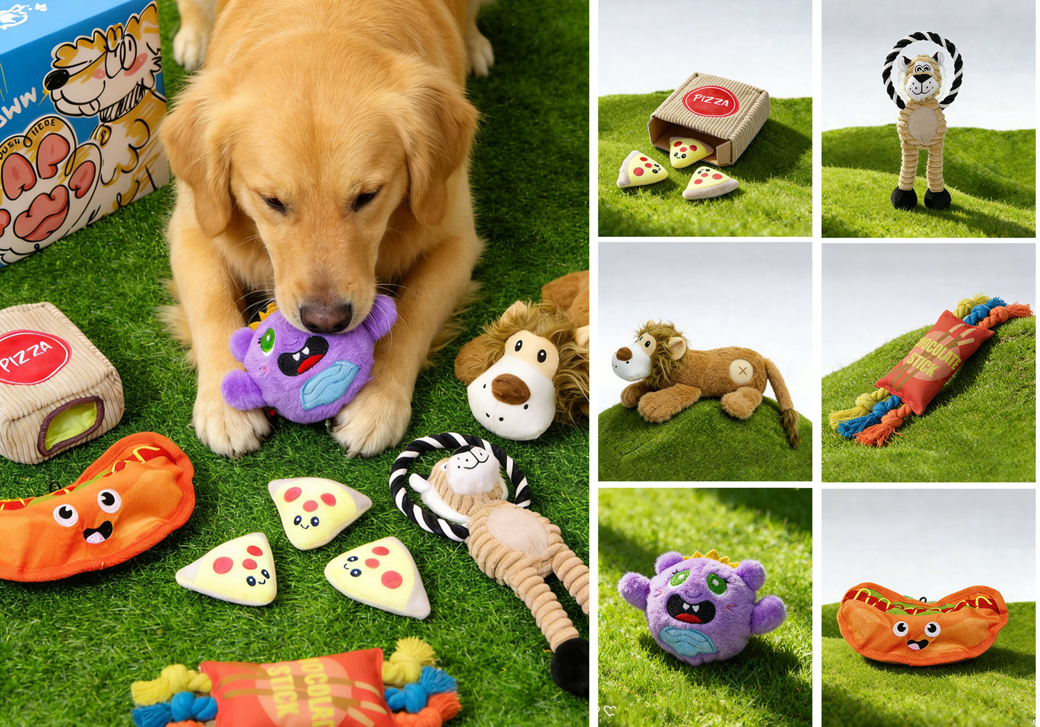 Plush Lion, Squeaky Monster Ball, Rope Tiger, Squeaky Hot Dog, Rope Candy, and Pizza Treat Pouch.